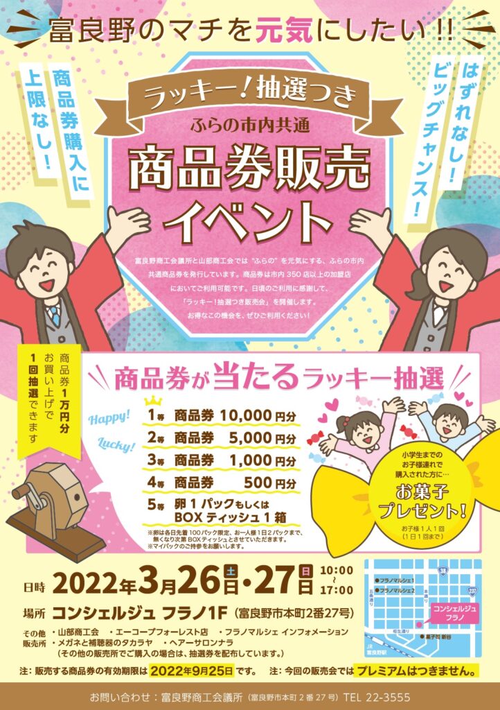 ラッキー抽選つきふらの市内共通商品券販売イベントを行います。商品券1万円購入ごとに1回の抽選で、商品券や卵・箱ティッシュのいずれかが必ず当たります。この機会にぜひお買い求め下さい。