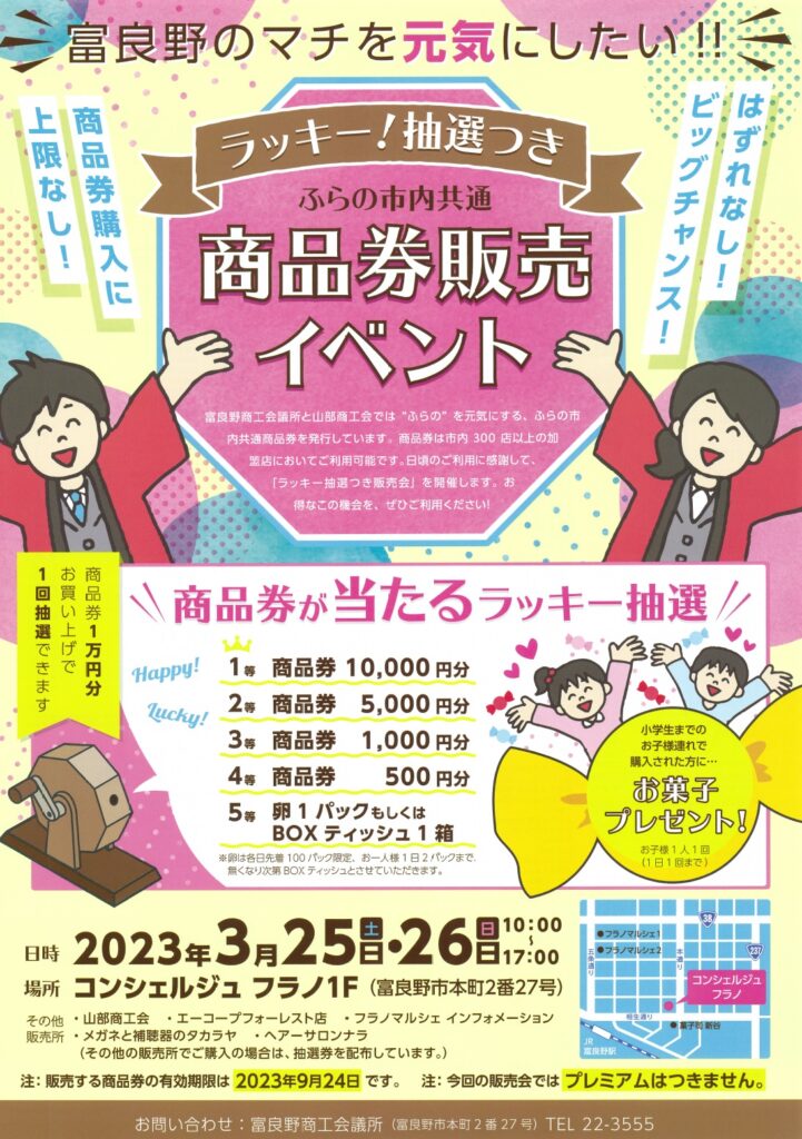 ラッキー抽選つきふらの市内共通商品券販売イベントを行います。商品券1万円購入ごとに1回の抽選で、商品券や卵・箱ティッシュのいずれかが必ず当たります。この機会にぜひお買い求め下さい。