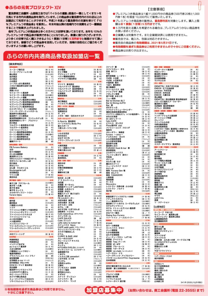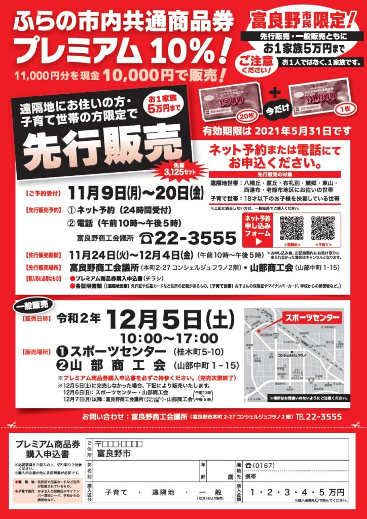 2020年10月29日 / 最終更新日 : 2020年10月30日 staff お知らせ プレミアムつき商品券販売のお知らせ 今年もプレミアムつき「ふらの市内共通商品券」を販売します。 先行販売 申込フォーム 遠隔地世帯の方はこちらから子育て世帯の方はこちらから チラシPDF プレミアムつき商品券チラシ表面ダウンロード プレミアムつき商品券チラシ裏面ダウンロード