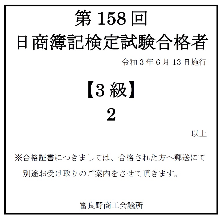 2021年6月28日 / 最終更新日 : 2021年6月18日 staff 検定 第158回 日商簿記検定試験合格発表(3級) 令和3年6月13日施行 日商簿記検定試験合格発表 第158回簿記合格発表ダウンロード