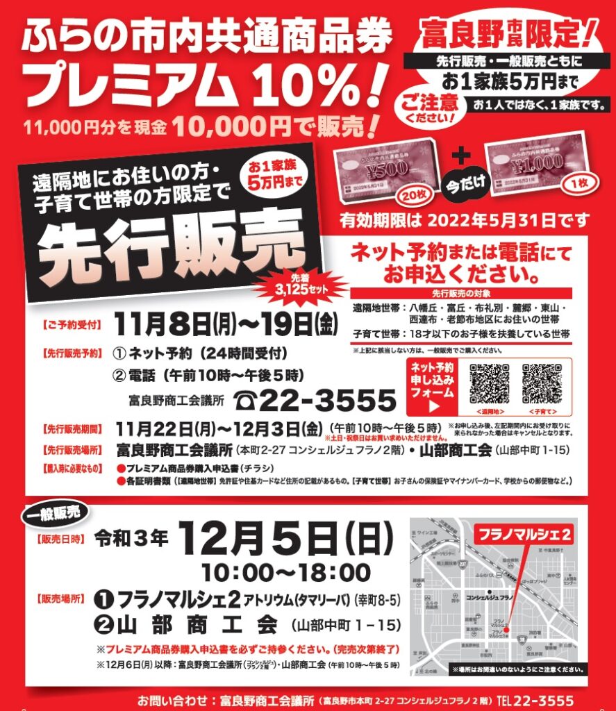 2021年10月28日 / 最終更新日 : 2021年10月28日 staff お知らせ プレミアムつき商品券販売のお知らせ 今年もプレミアムつき「ふらの市内共通商品券」を販売します。 先行販売 申込フォーム 遠隔地世帯の方はこちらから ※受付は11月8日開始です。子育て世帯の方はこちらから ※受付は11月8日開始です。 チラシPDF 取扱加盟店はチラシでご確認下さい。 プレミアム商品券チラシ_2021ダウンロード