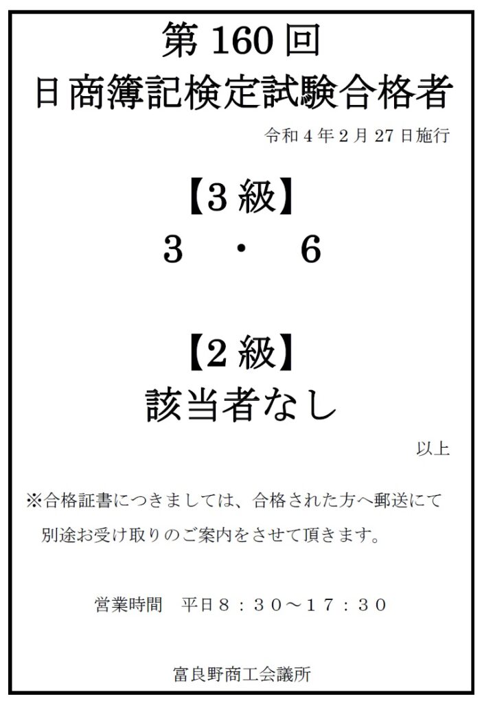 2022年3月14日 / 最終更新日 : 2022年2月28日 staff 検定 第160回 日商簿記検定試験合格発表(3級・2級) 令和4年2月27日施行 日商簿記検定試験合格発表 第160回簿記合格発表ダウンロード