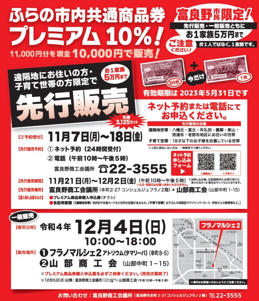 2022年10月25日 / 最終更新日 : 2022年11月17日 staff お知らせ プレミアムつき商品券販売のお知らせ 今年もプレミアムつき「ふらの市内共通商品券」を販売します。 先行販売 申込フォーム 遠隔地世帯の方はこちらから ※受付は11月7日開始です。 子育て世帯の方はこちらから ※受付は11月7日開始です。 チラシPDF 取扱加盟店はチラシでご確認下さい。 プレミアムつき商品券販売会チラシダウンロード