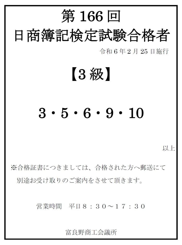 2024年3月11日 / 最終更新日 : 2024年2月26日 staff 検定 第166回 日商簿記検定試験合格発表(3級) 令和6年2月25日施行 第166回日商簿記検定試験合格発表 第166回日商簿記検定合格発表ダウンロード
