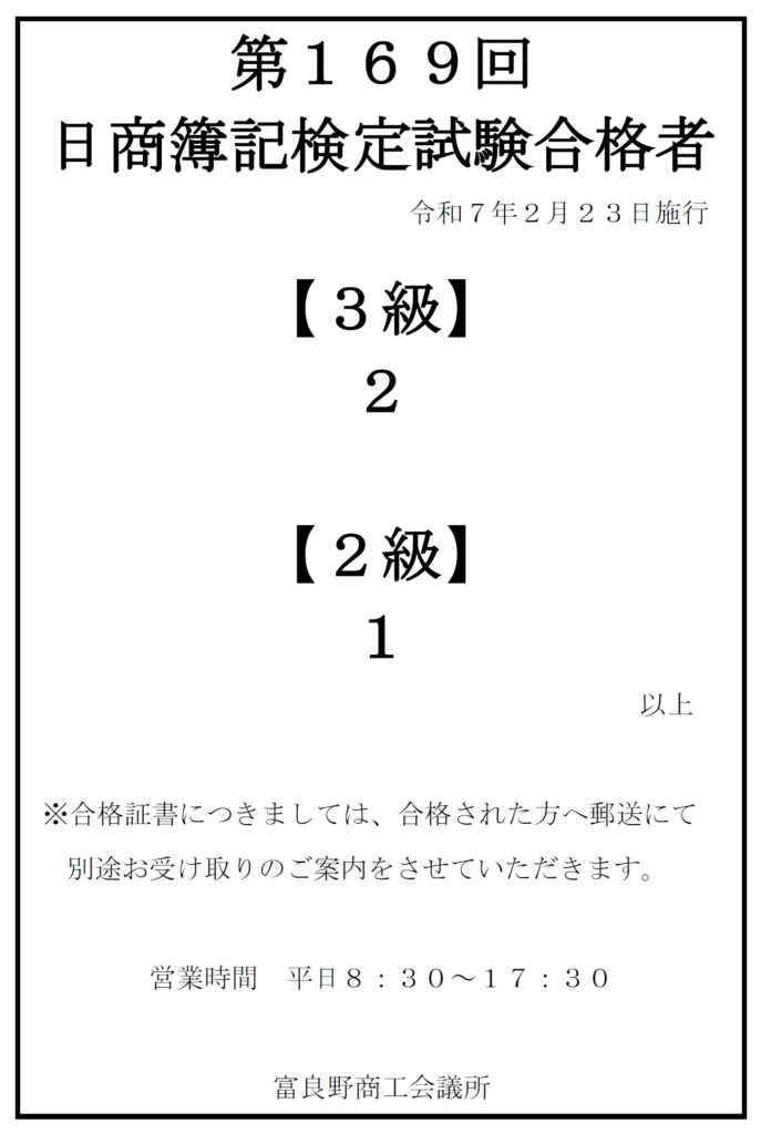 2025年3月10日 / 最終更新日 : 2025年2月25日 staff 検定 第169回 日商簿記検定試験合格発表(3級・2級) 令和7年2月23日施行 第169回日商簿記検定試験合格発表 第169回日商簿記検定合格発表ダウンロード